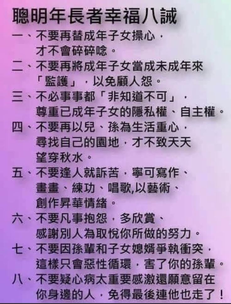 不要再替成年,子女粗心,才不會碎碎念。不必事事都非要知道不可。不要再以兒,孫維生活中心。不要以孫輩和兒媳婦,女婿爭執衝突,這樣只會惡性循環害了孫輩!請大家細內來。